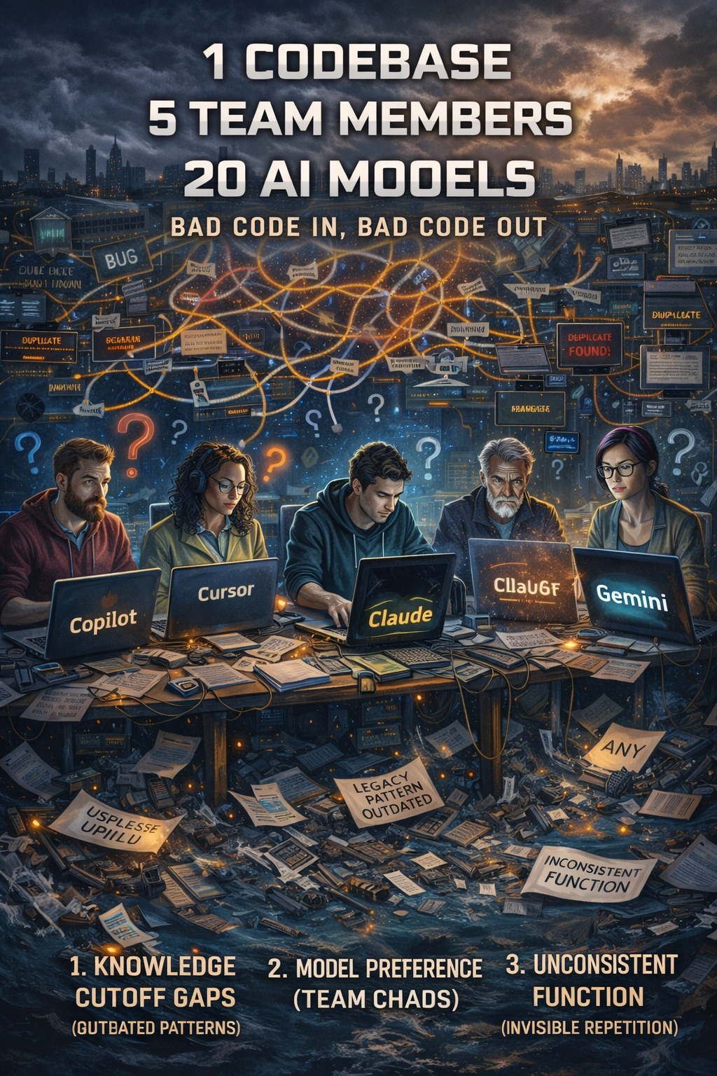 Month 3-4: 🤔 Hmm. Our AI assistants keep suggesting we create utilities that... already exist? They're also suggesting 3 different patterns for the same API endpoint. Which one is "right"?